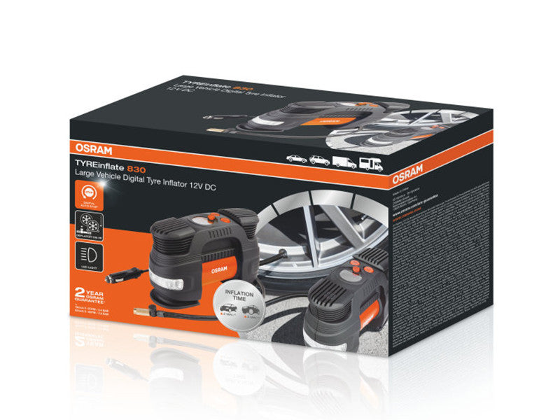 Compresor Osram model 830 cu cablu de alimentare de 4 metri. Compresorul dispune de un compartiment pentru depozitarea capselor de ventil. Multimetrul amplasat deasupra butonului de pornire poate monitoriza valorile presiunii in kPA, bar si PSI. Alimentarea se face la 12V, prin mufa de bricheta auto. In pachet sunt incluse trei adaptoare pentru umflarea anvelopelor: bicicleta, motocicleta, mingi si altele.