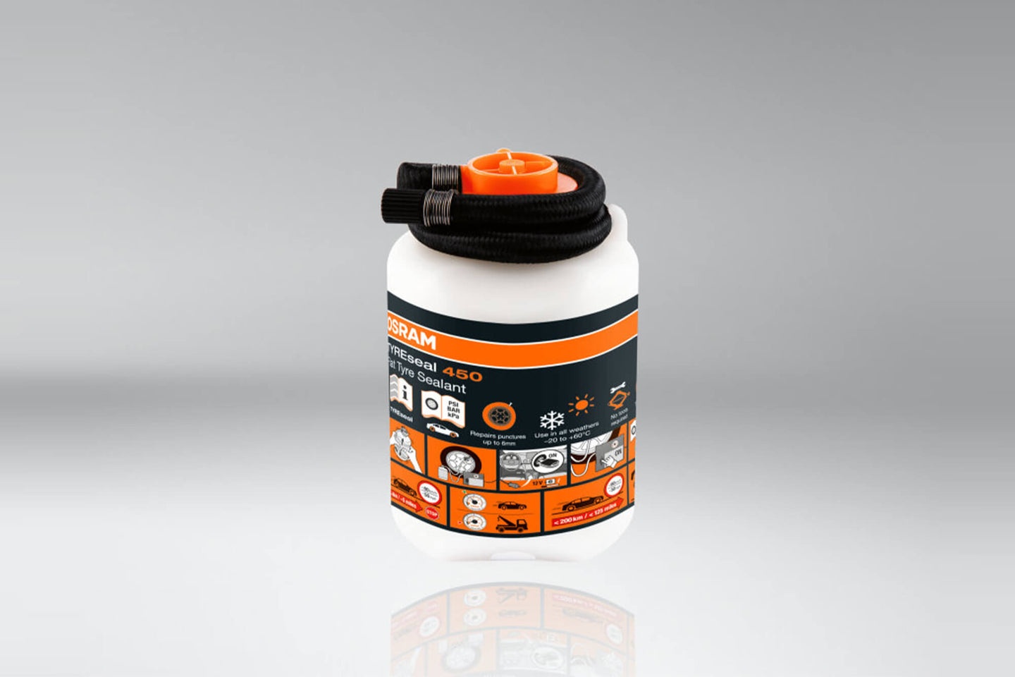 Osram Tyreseal 450 este un produs pentru repararea pana. Poate fi folosit ca inlocuitor pentru trusa originala de reparare a penei. Spuma sigilanta este utila atunci cand ai o pana la anvelopa masinii si nu ai roata de rezerva. Reparatia este permisa pentru pana de pana la 6 mm. Dupa utilizarea produsului, poti circula pana la 200 km. Unul dintre principalele avantaje ale produsului Tyreseal 450 este ca poti spala anvelopa pentru a repara pana, astfel nu va mai fi nevoie sa faci o noua gaura.